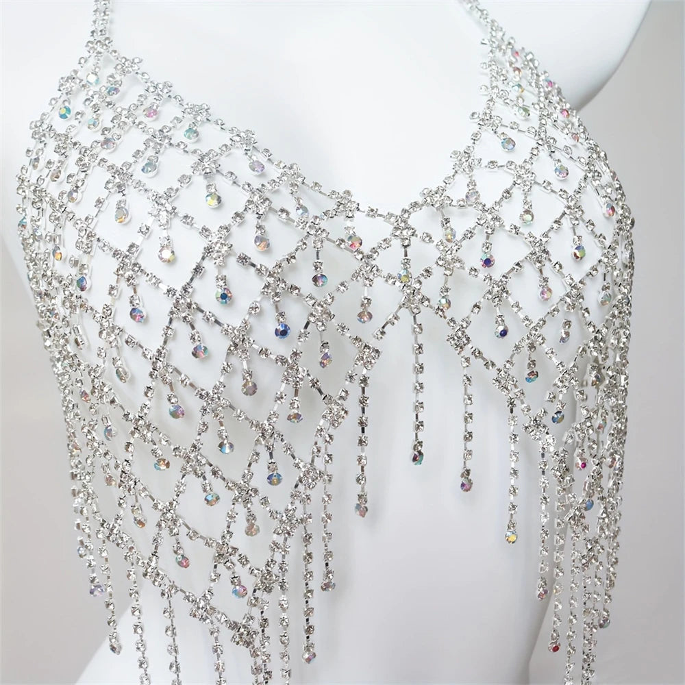 Sublimez votre silhouette avec cette pièce d'orfèvrerie corporelle, conçue pour les louves qui règnent sur la nuit. Ce harnais de poitrine, véritable cascade de cristaux, habille votre peau d'un voile étincelant qui capte chaque reflet de lumière. Son design en maille fine, orné de pampilles délicates en forme de gouttes d'eau, crée un mouvement hypnotique à chacun de vos pas. Que vous le portiez sur une tenue minimaliste ou à même la peau pour un look audacieux, cet accessoire transforme votre présence en une apparition magnétique et luxueuse.