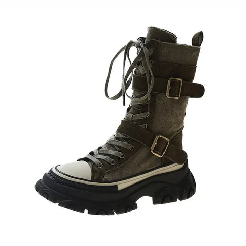 Adoptez une allure rebelle et décontractée avec ces bottes montantes qui combinent l'esprit militaire et l'esthétique Rock moderne. Leur tige en toile Canvas marron et laçage intégral s'opposent à une semelle plateforme épaisse en caoutchouc, assurant à la fois confort et style audacieux. Parfaites pour l'automne, ces bottes mi-mollet sont idéales pour celles qui recherchent un modèle durable, tendance et facile à enfiler (malgré les lacets, le style est désigné comme Slip-On dans les spécifications). Elles offrent un talon moyen de 3 à 5 cm pour une démarche assurée.