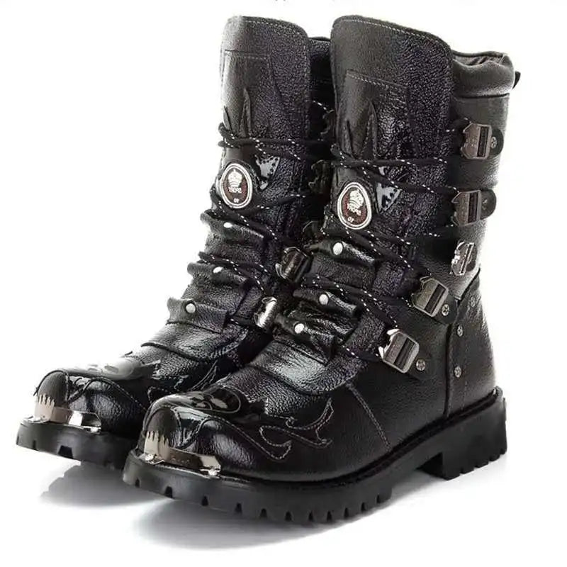 Affirmez un style Punk Rock assumé avec ces bottes mi-mollet pour homme. Leur design High Top est renforcé par une coque en métal au niveau de l'embout, offrant une protection maximale. Conçues en PU (simili-cuir), elles sont dotées d'une semelle extérieure en caoutchouc et d'un talon bas (1-3 cm) pour un confort de marche quotidien. Le laçage intégral croisé ajoute un élément de mode fort, parfait pour l'hiver et les looks décontractés.