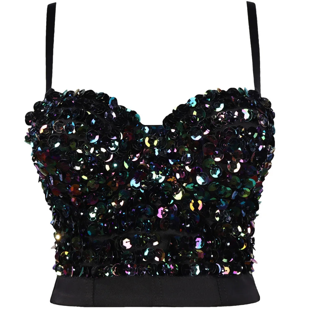 Finition Haute Joaillerie : Architecture de strass scintillants disposés en lignes graphiques pour sculpter visuellement le buste et capturer la lumière.