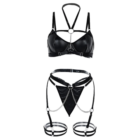 Préparez-vous à régner sur la nuit avec cet ensemble sculptural, véritable fusion entre la haute lingerie et l'esthétique Heavy Craft. Conçu pour les louves qui allient puissance et mystère, ce set en cuir PU brillant capture chaque reflet pour créer une aura magnétique. Sa structure complexe, ornée de chaînes métalliques intégrées et de jeux de lanières ajustables, dessine une silhouette d'armure moderne tout en offrant le confort d'une conception sans armatures. Que ce soit pour une soirée privée exclusive ou pour affirmer votre autorité stylistique, cette parure est l'atout ultime des membres les plus audacieux de la meute.