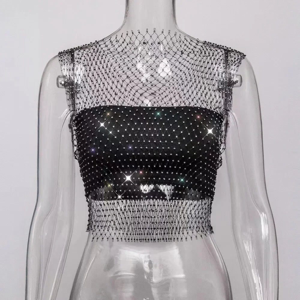 Devenez une étoile filante au cœur de la nuit avec ce crop top en résille scintillante, l'accessoire ultime pour les louves qui ne passent jamais inaperçues. Ce débardeur révolutionne le concept de "Beach Cover Up" en fusionnant une maille filet (fishnet) ultra-extensible avec une constellation de strass brillants qui captent chaque éclat de lumière. Que vous le portiez sur un bikini audacieux pour une fête sur la plage ou par-dessus un soutien-gorge noir pour dominer le dancefloor d'un nightclub, ce top "Hollow Out" crée un jeu de transparence magnétique. C'est la pièce maîtresse pour transformer un look simple en une tenue de club iconique et lumineuse.