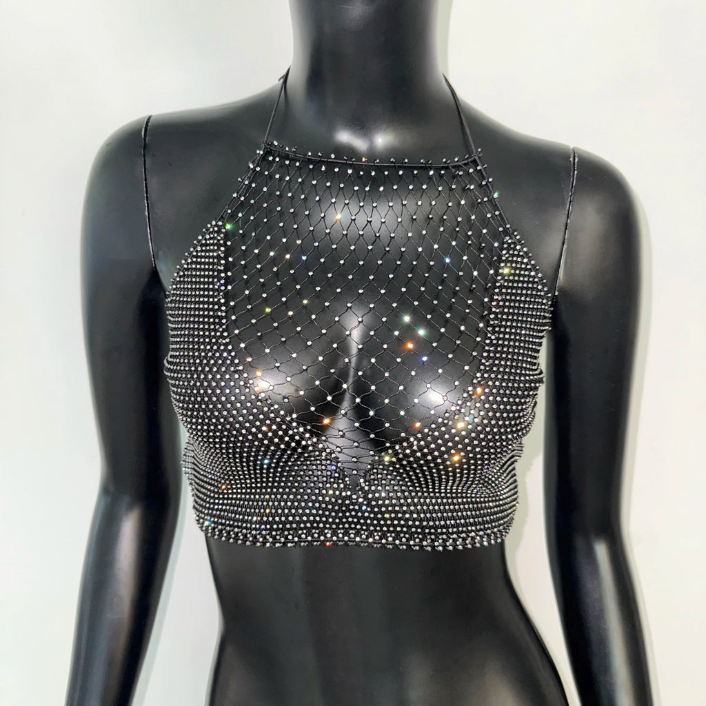 Transformez-vous en une créature de lumière avec ce top licou en résille scintillante, une pièce maîtresse pour les louves qui dominent les dancefloors et les festivals d'été. Ce haut d'exception fusionne une structure en filet délicate avec un sertissage de cristaux "Bright Diamond" qui créent une constellation hypnotique sur votre peau. Son design "Backless" et sa coupe courte soulignent votre silhouette avec une assurance radicale, faisant de vous l'épicentre magnétique de chaque fête. Portez-le sur votre lingerie préférée ou à même la peau pour un look "Spicy Girl" qui ne connaît aucune limite.